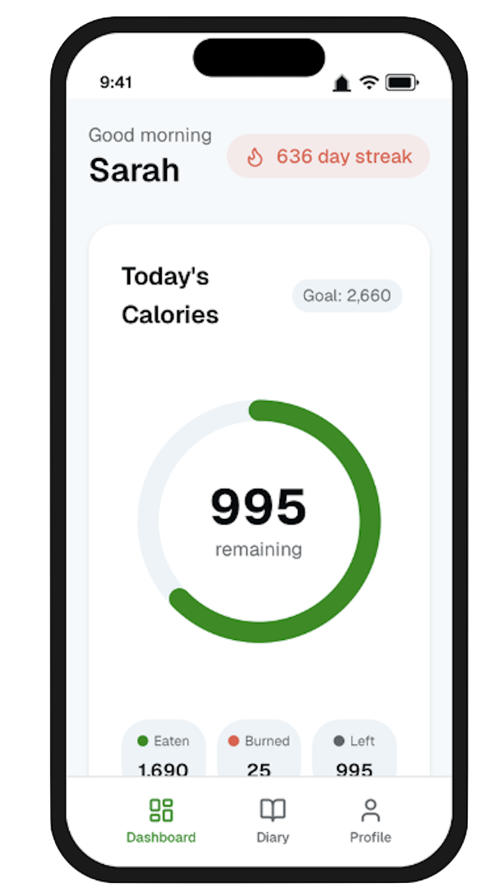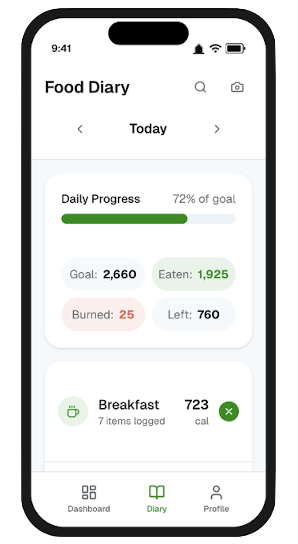 The dashboard was redesigned to give users an immediate and clear understanding of their daily progress. Instead of relying on dense information, the interface now centers around a simplified calorie tracker that highlights what matters most, being how many calories remain. Supporting information, such as calories eaten and burned, is still present but presented in a cleaner, more digestible format. Additional elements like step tracking, exercise summaries, and weekly progress trends are surfaced in a way that supports motivation without overwhelming the user.