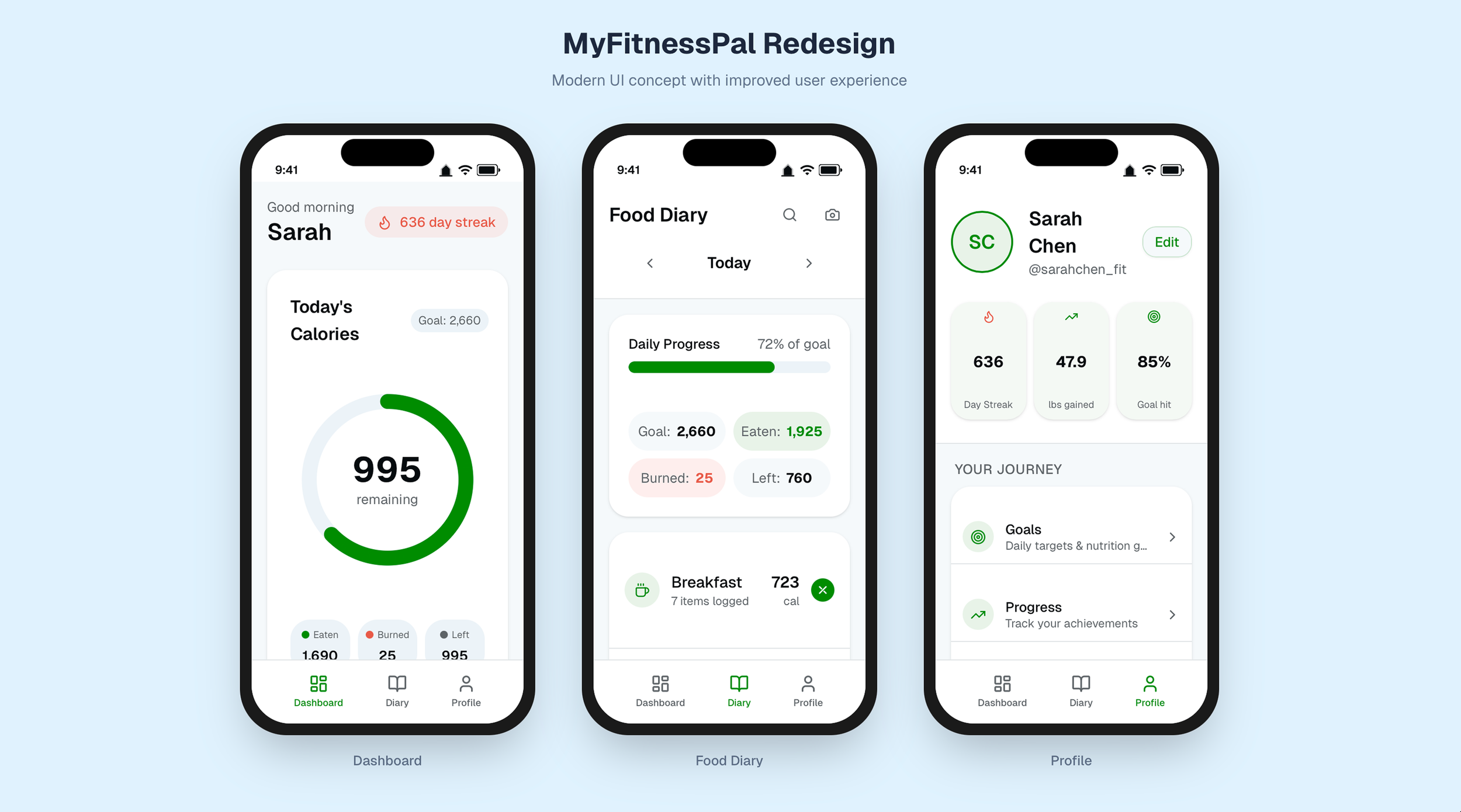 MyFitnessPal is one of the most widely used nutrition tracking apps, but its interface can feel overwhelming, especially for new users trying to build consistent habits. This project focused on redesigning key screens to improve clarity, reduce cognitive load, and create a more intuitive daily tracking experience.