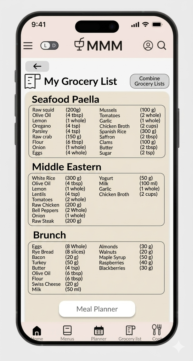 MMM automatically combines ingredients across selected menus into a single, organized grocery list. Grouping by menu maintains clarity while reducing the need for manual list management.